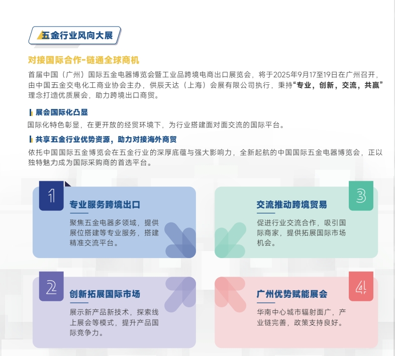 在2025年的金秋时节,中国(广州)国际五金电器博览会暨工业品跨境电商出口展览会将在广州琶洲展馆隆重开幕。本次盛会将于9月17日至19日举行,为期三天的展览将为中国乃至全球的五金电器及工业品行业注入全新活力与机遇。